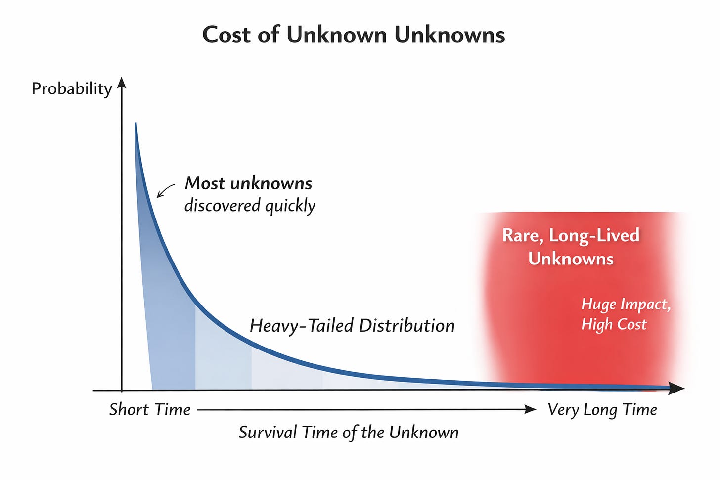 One reason unknown unknowns are easy to underestimate is that most of them don’t stay unknown for very long. Many are discovered quickly, which can create the impression that the problem is limited. But some unknowns persist for a long time. In statistical terms, the time an unknown unknown survives follows a heavy-tailed distribution. Long-lived unknown unknowns are rare, but when they do occur, their impact is so large that they are very dominant in the total cost.