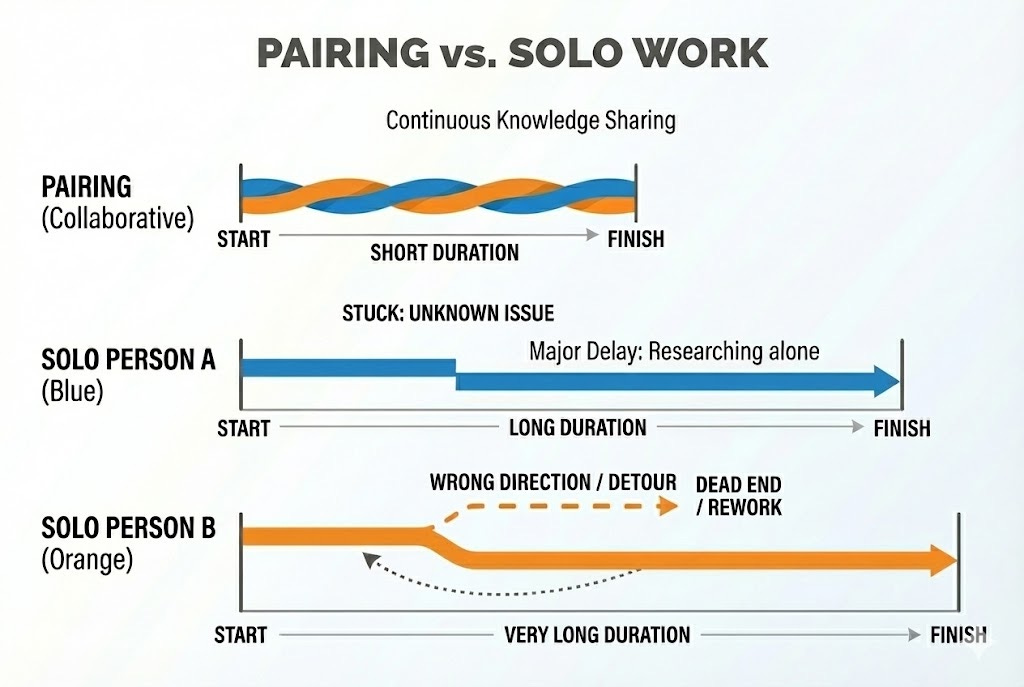 A common reaction from new team members when starting with pairing or mobbing is that they feel less productive. This makes perfect sense. Close collaboration reduces long-lived unknown unknowns, which has a significant impact when they occur. However, as mentioned earlier, these are far less common than short-lived unknowns. As a result, there are periods when multiple people are working together even though each could make progress independently.
